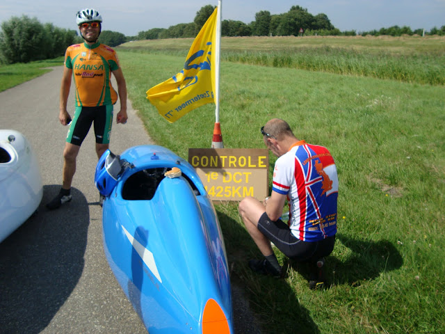Als we in het buitengebied komen halen we de boel snel in en gaan we los, het is warm maar te doen, wel veel drinken, maar wat is veel, ik heb 2,5 ltr bij me en kan hiermee 150km fietsen, Eduard heeft aan 5 ltr niet genoeg, dus tja wat is genoeg. Na 60km de geheime controle, Leo zit te wachten, we stempelen en eten wat, en gaan door, hierna komen de Delta werken waar ik nooit geweest ben, een beetje afsluitdijk, dus goed te doen. Tom gaat voorop en Eduard en ik erachter aan, waarbij Eduard altijd op 50 tot 100 mtr achter me rijdt. Dat is voor hem wel makkelijk, zo weet hij altijd waar we heen gaan en verliest geen overbodige snelheid als Tom twijfelt wat hij moet doen bij een afslag of splitsing. voorrijden is niet altijd makkelijk en vraagt extra energie omdat je vaak teveel remt, vanwege onzekerheid, onbekendheid en vreemde situaties.
