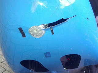 Jammer Peter, net een nieuwe fiets krijg je zoiets! Nu ja, je kan het wel weer oplappen, maar leuk is het nooit. Maar ondanks een beetje lapwerk fietsen die velomobielen met "battle scars" net zo goed als een kreukvrije……gelukkig wel!